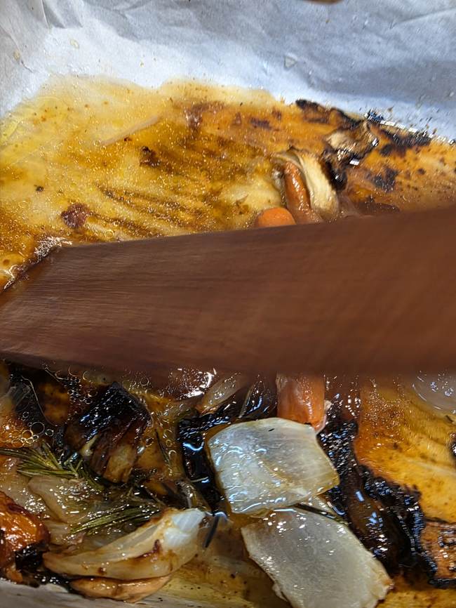 2. Take about a half a cup of the chicken broth and pour it into the roasting pan. Make sure you gently work it all over those veggies and get all the yummies off the paper (or the pan if you didn't line it).