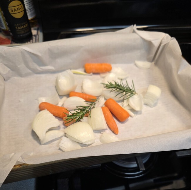 2/3 of the onion, all of the carrots, one of the rosemary sprigs, and all but one of the garlic cloves got in the bottom of the roasting pan.
